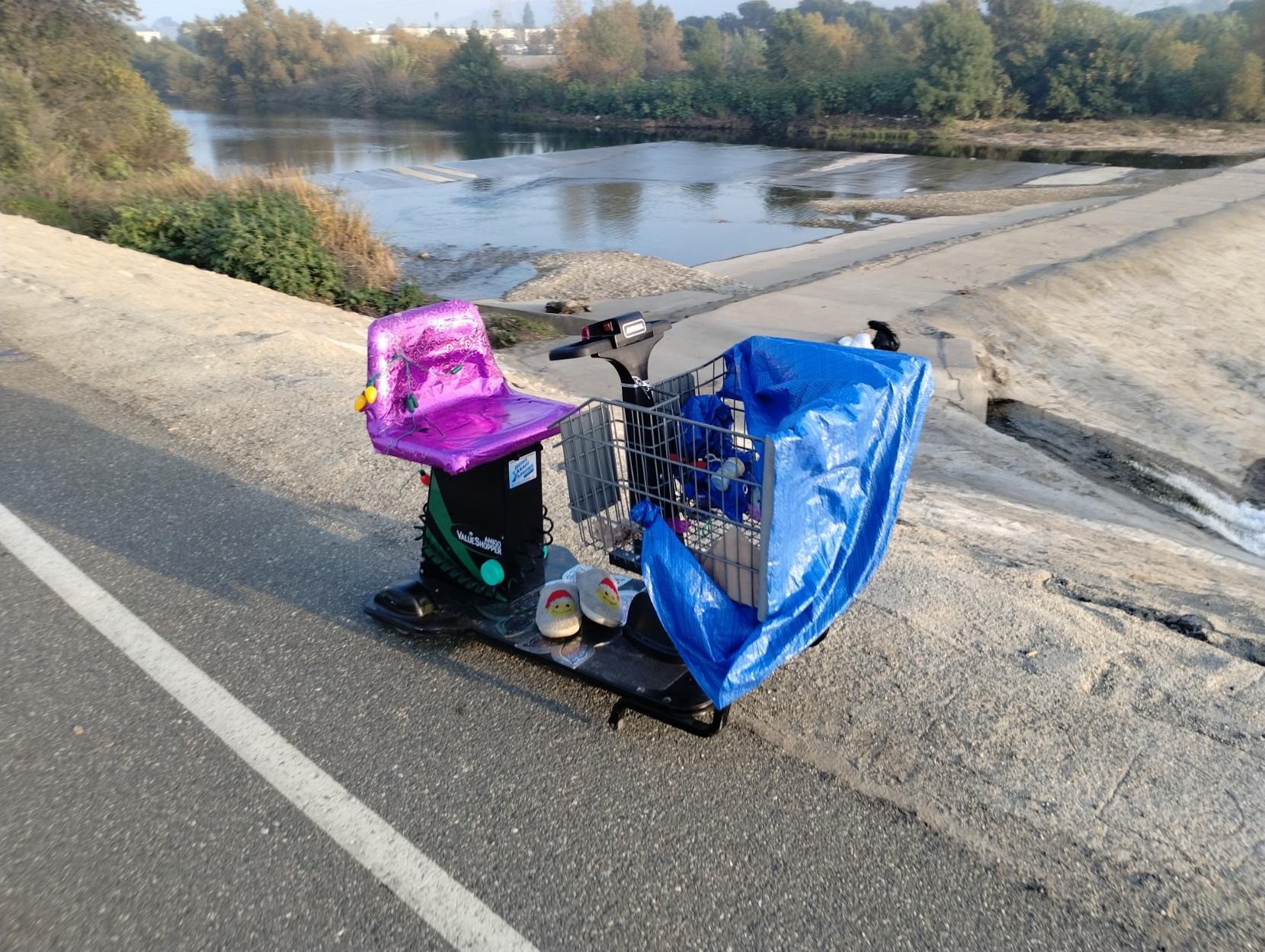 Someone who lives down by the river appears to have stolen a grocery store mobility scooter and decorated it with wrapping paper