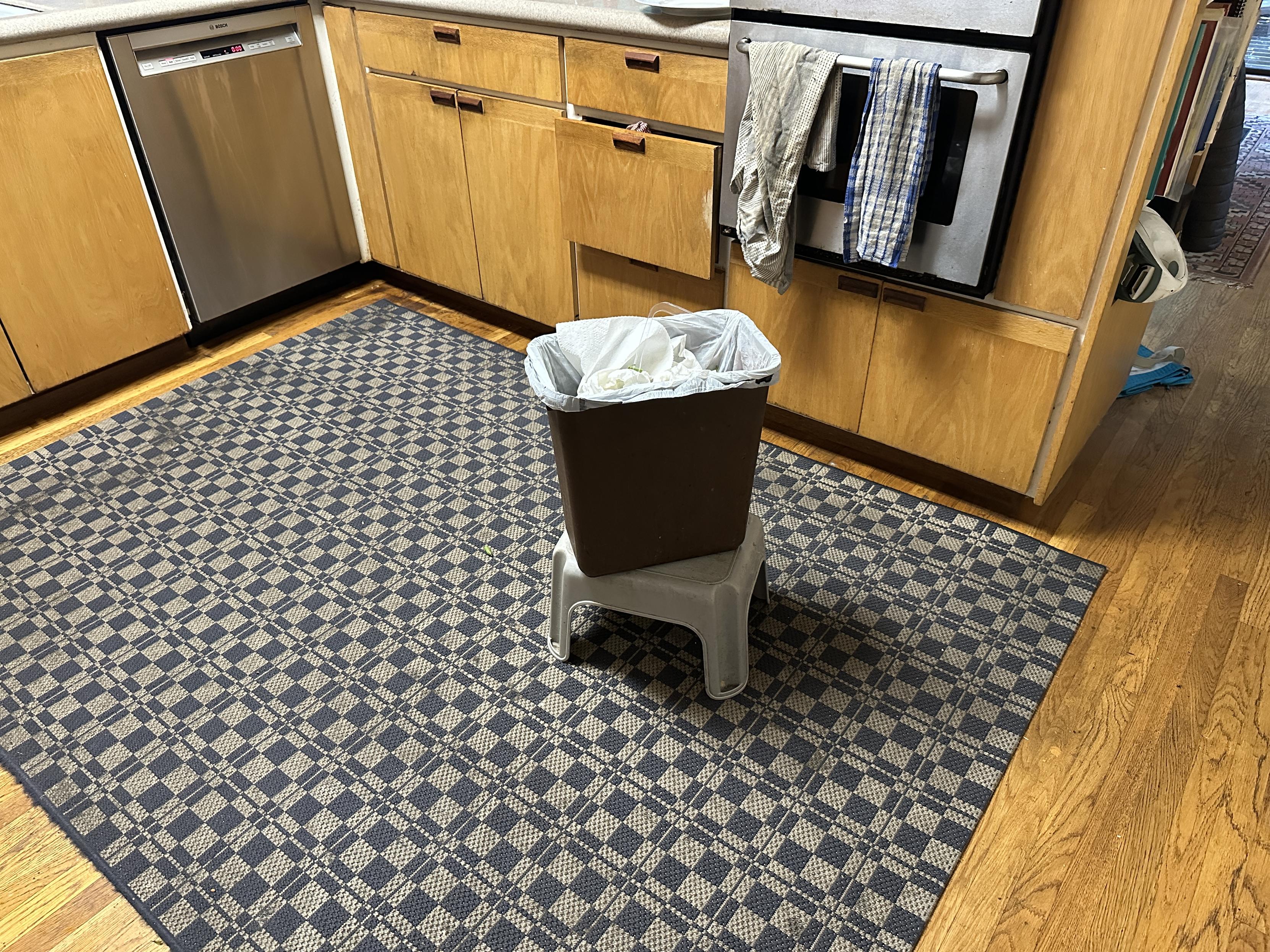 Design Challenge: In the tiny kitchen I must have TWO objects on the floor that I trip over: 1. Waste Basket (Because it's an apartment it's like those at the office, small and simple a bucket.) 2. step stool (because i am short) It seems to me that this could be somehow made into one object. A garbage can I could stand on. Yes I could turn it over but I think you can see how that is not ideal. Any designers out there looking for their big break?