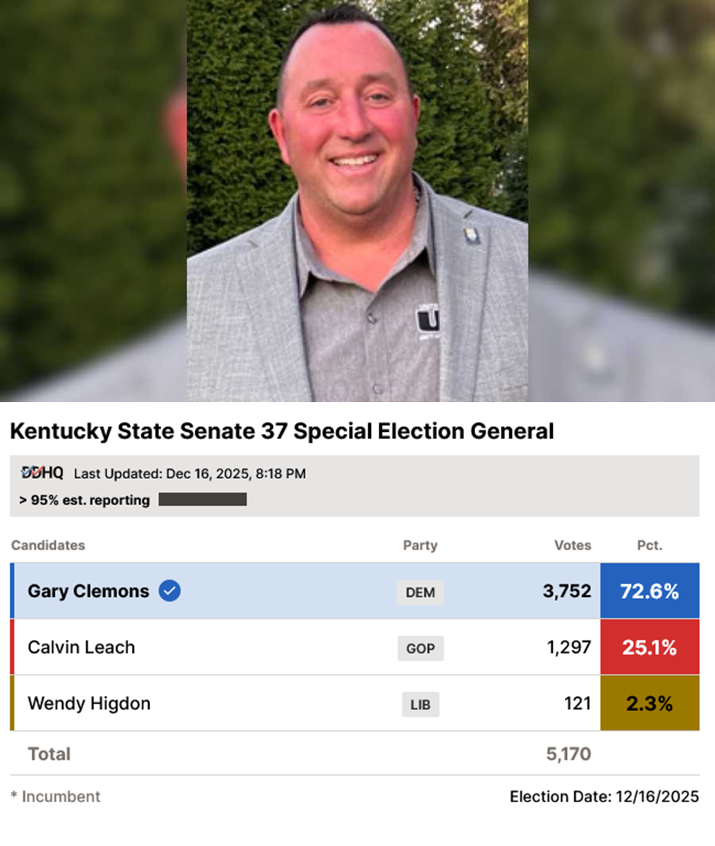 Democrat Gary Clemons wins in a state Senate election in Kentucky, beating his Republican opponent 72% to 25%.